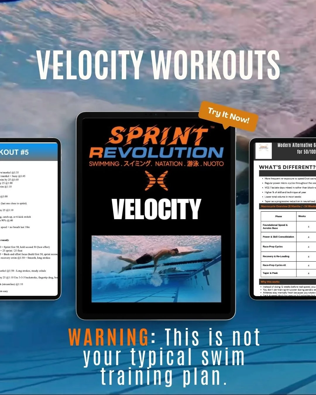 The 50 free is around 20 to 22 seconds. That is pure ATP PC system. Max neural drive. Explosive mechanics. You don’t need two hours to train that.
